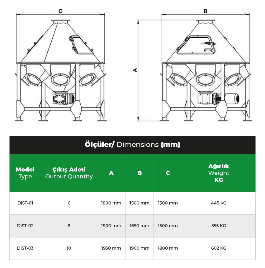 Ürün cinsine göre ürünü değişik yollara şevkini sağlar. Bu sayede gereksiz klepe ve diğer yönlendirme elemanının kullanılmasına gerek kalmaz. Özel istek üzerine değişik ebatlarda ve çıkış sayılarında üretim yapılabilir. Özellikle depolama işlemlerinde kullanılır. Elektrik motoru ile tahrik edilir. Üzerindeki 9 konumlama sensörü ile kumanda edilmesi kolay ve sorunsuzdur.