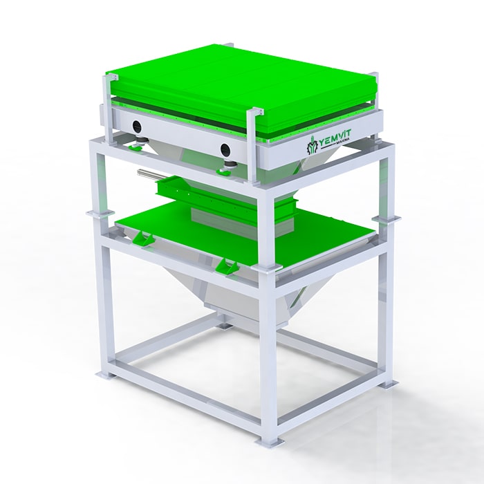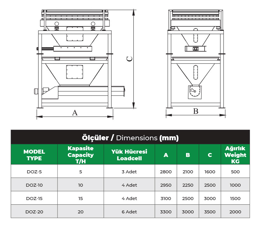 Ürün reçetesi oluşturmak için hammaddeleri ayrı ayrı tartarak tek partide makinanın çıkışında bulunan pnömatik sürgüler sayesinde bunkere doldurulan ürünler belli süre içerisinde tahliye edilir. Titreşimden ve sesten etkilenmemesi için lastik takozlarla esneme olanağı verilen dozajlama daha hassas tartım yapabilmektedir.