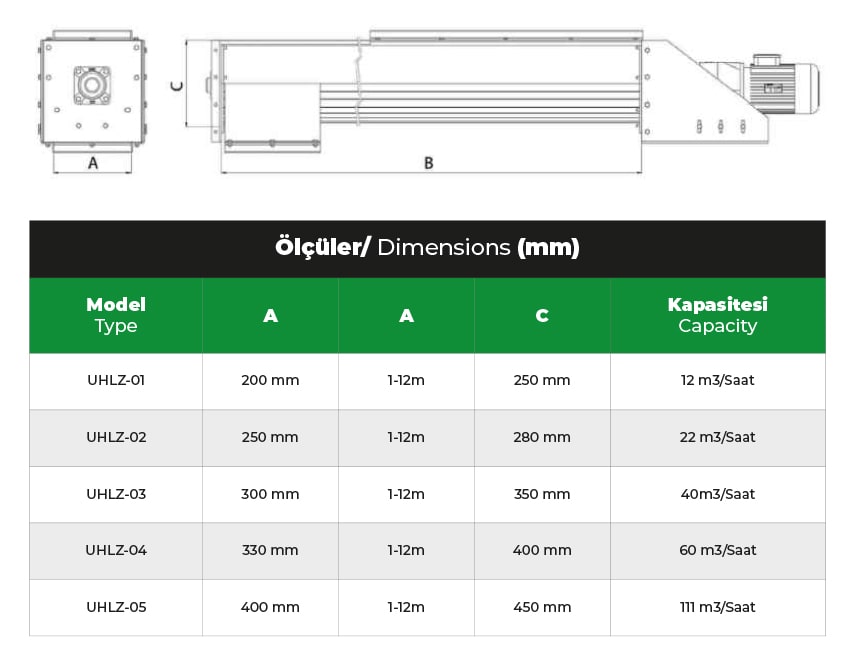 Hammadde veya mamülün yatay olarak taşınmasında kullanılır. Gövde tipi U Gövde sacı St37 veya isteğe bağlı galvanizli ve 304 krom olarak üretilir. Gövde içerisinde aktarmayı sağlayan boru üzerine yapraklar sarılarak imal edilmiştir. Yapraklar standart veya taşınan mamüle göre özel tasarlanabilir. Motor kapasite ve mesafeye göre zincir dişli veya kaplinle aküple edilebilir.